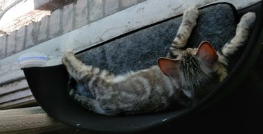 Happy F4 Jungle Curl male. They call him the Energizer bunny because he likes to keep playing.